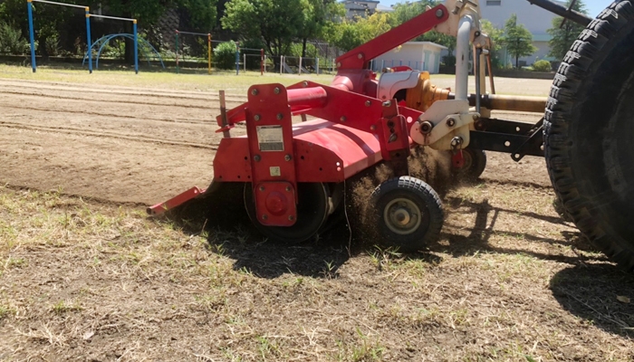 まずはグラウンドに生い茂った雑草を除去するため、当社の雑草除去専用マシン、スパイラルカッターで雑草と根をミンチ状にします。雑草の処理が完了しましたら、ワイドタイヤローラーにて1次転圧を行います。表層から約3cm〜5cmの厚みで根切りをするため、雑草の根絶を図る工法、テーラーアタッチメント工法で表層の撹拌を行い、ワイドタイヤローラーで再度転圧します。その後、カンナカッターアタッチメントで不陸整正を行い、ワイドタイヤローラーで仕上げ転圧した後、当社が開発した人畜無害の雑草防除効果のあるサプレッションリキッドを散布します。